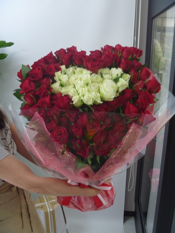 正面から見てボリュームタイプの赤バラ大輪100本花束♪
